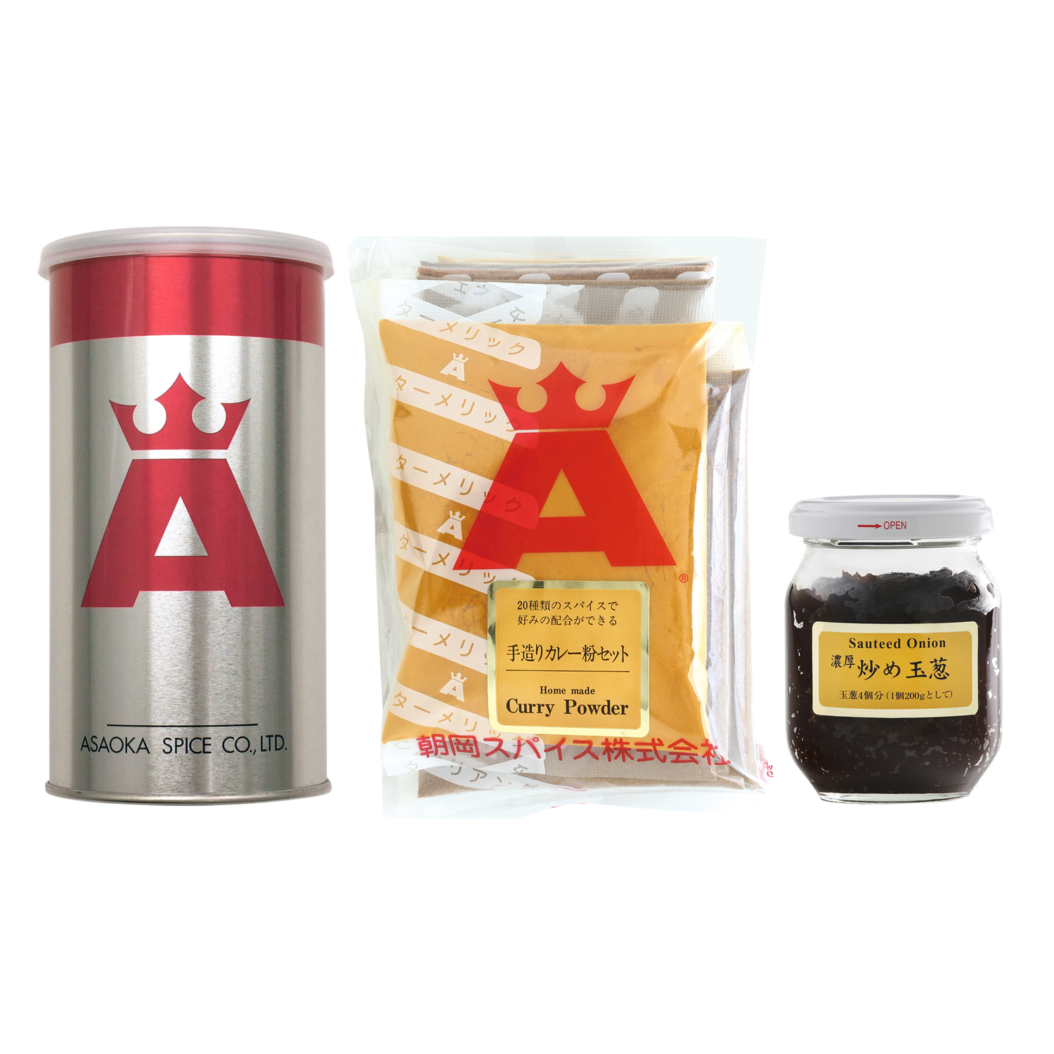 カレー粉300g(約90~100皿相当)ができるスパイスのセット。20種類のスパイスが小分けされています。手軽にこだわりの自家製カレー粉が作れます。作る楽しみが味わえる朝岡オススメの一品に北海道産の玉葱を使用し、玉葱本来の甘味・旨味を油だけで引き出した炒め玉葱をセットにいたしました。炒め玉葱は一瓶に約4個分が凝縮。少量で料理がグッと美味しくなります。